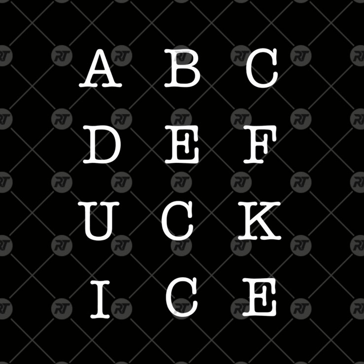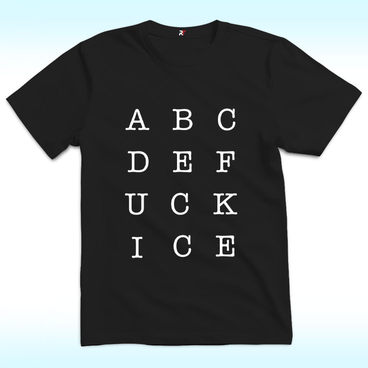 The abcdefuck ICE shirt turns a clean, minimalist layout into a sharp act of protest. Arranged like a simple alphabet grid, the white, typewriter-style letters sit centered on a black background, guiding the eye line by line until the hidden message reveals itself. What appears quiet and orderly at first glance becomes unmistakably bold once read in full: fuck ICE—a deliberate statement of opposition to U.S. Immigration and Customs Enforcement.