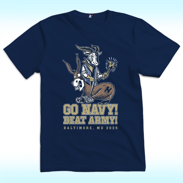At the center is a bold illustration of a goat—an age-old symbol of dominance—binding a donkey, a playful and unmistakable metaphor signaling Navy’s upper hand. The artwork balances sharp humor with competitive edge, transforming a historic clash into a striking, memorable image. Deep navy tones frame the scene, anchored by “Go Navy! Beat Army!” and Baltimore, MD 2025, grounding the design firmly in its moment.