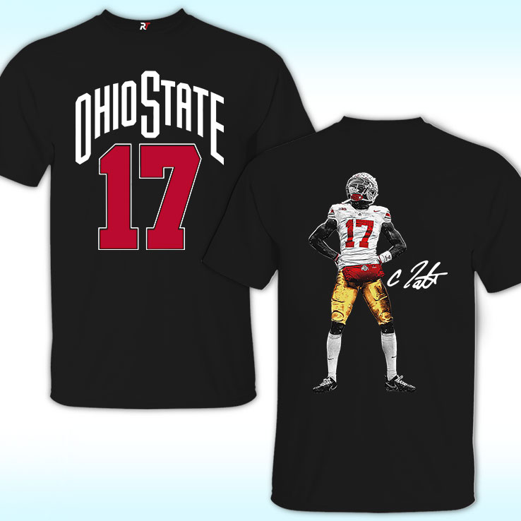 This Carnell Tate shirt isn’t just apparel—it’s a statement. The front features bold, arched “OHIO STATE” lettering in white, paired with Tate’s iconic #17 in scarlet red, instantly drawing attention to the rising star of the Buckeye offense.