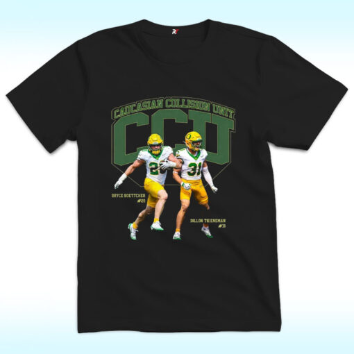 Introducing the Caucasian Collision Unit (CCU) — the nickname taking Ducks Nation by storm. This Caucasian Collision Unit Shirt pays tribute to the Oregon Ducks’ hard-hitting defensive duo: Bryce Boettcher (#28) và Dillon Thieneman (#31). Together, they’ve become fan favorites for their fearless play, bone-rattling tackles, and undeniable chemistry on the field.