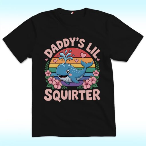 When cute meets cheeky, you get a shirt that turns heads and sparks laughter. The Daddy’s Lil Squirter Shirt features an adorable cartoon whale joyfully spraying water beneath a retro rainbow sunset—framed by tropical flowers and hearts.