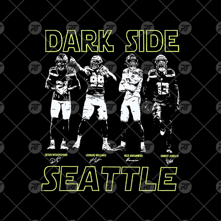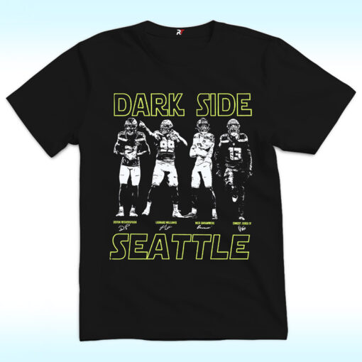 The design pairs bold DARK SIDE lettering with SEATTLE below, framing a gritty lineup of defenders locked into powerful, game-ready poses. High-contrast black-and-white player imagery gives the shirt an intimidating edge, while sharp neon accents echo the Seahawks’ signature colors. Every detail reinforces the idea of a defense that thrives on fear, intensity, and control.
