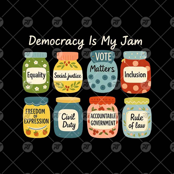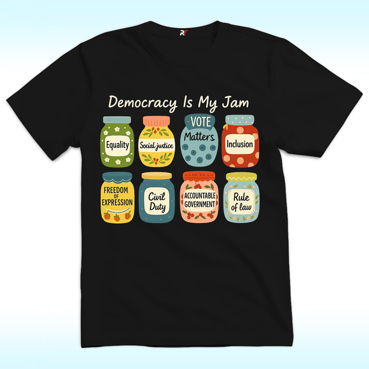 Each illustrated jam jar is a flavorful reminder of what makes democracy worth preserving. Whether you’re marching, voting, or simply speaking up, this Democracy Is My Jam Shirt turns everyday activism into a vibrant visual statement.