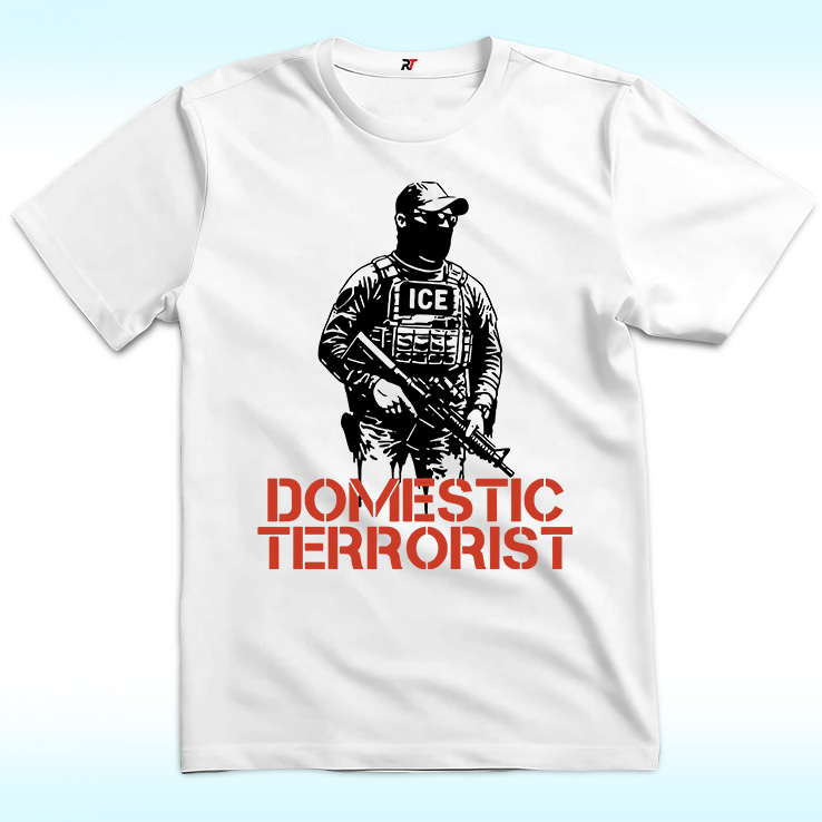 The Domestic Terrorist Shirt uses stark imagery and charged language to criticize U.S. Immigration and Customs Enforcement, framing the agency as a source of fear rather than protection. By pairing the image of an armed ICE agent with the phrase “Domestic Terrorist,” the design makes an intentionally provocative statement about power, state violence, and accountability. Meant for those who oppose ICE’s actions and policies, the Domestic Terrorist Shirt relies on shock and symbolism to spark conversation, protest, and resistance through wearable art.