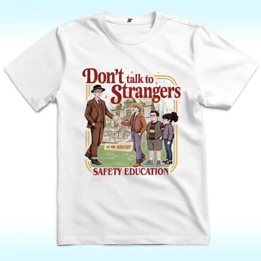 Framed like a vintage classroom poster, this Don’t Talk To Strangers Shirt tells its story through irony and misplaced trust. The phrase “Don’t Talk to Strangers” echoes familiar childhood safety lessons, while the illustration introduces Mr. Whatsit presenting himself as a calm, harmless authority figure.