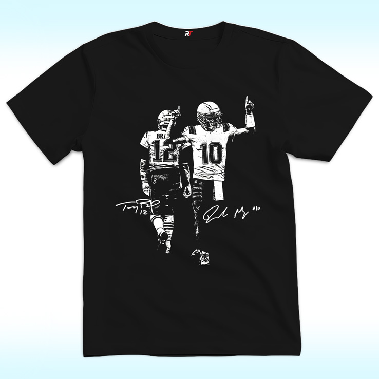 Rendered in a striking black-and-white style, the artwork feels timeless, while the printed signatures beneath each player add a personal, almost collectible touch. This Drake Maye & Tom Brady With Signature Shirt isn’t about one play or one season—it’s about continuity. It honors the dynasty that was built while embracing the future still being written, making it a powerful statement for Patriots fans who believe legacy and the next era matter just as much.
