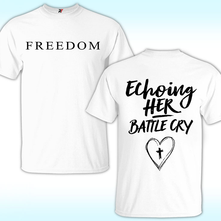 Inspired by Erika Kirk’s unwavering spirit and her powerful partnership with Charlie Kirk, the “Echoing Her Battle Cry” shirt is more than apparel—it’s a proclamation of purpose. On the front, the word “FREEDOM” stands simple yet profound; on the back, her rallying words resound, calling women of faith into bold action.