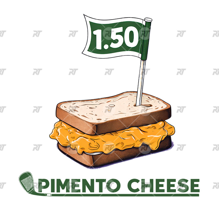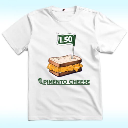 This shirt features a detailed illustration of the sandwich at its center, topped with a small golf flag marked “1.50,” a nod to its iconic status and famously classic price point. Beneath it, “PIMENTO CHEESE” appears in clean green lettering, echoing the colors of the course and grounding the overall look.