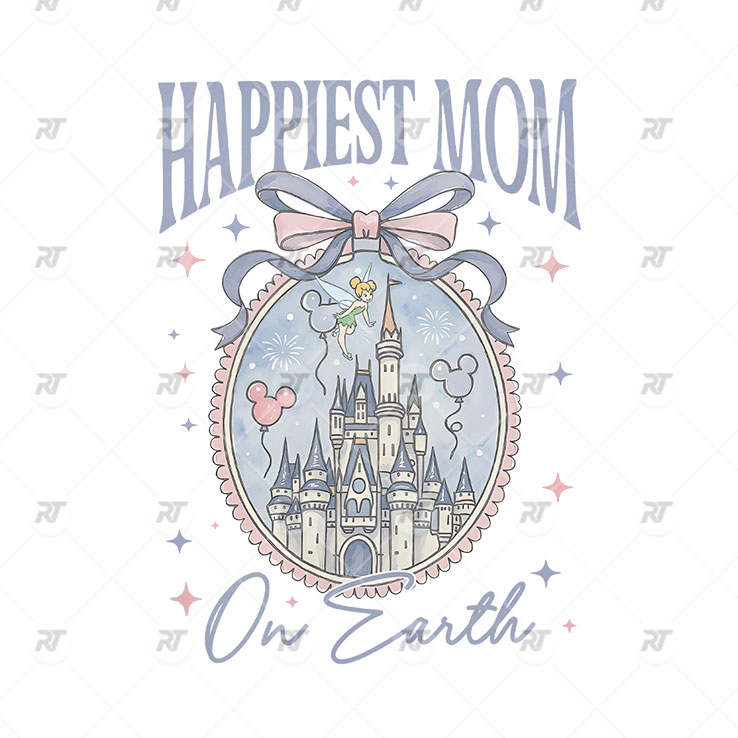 At the center, the Disney castle sits within a decorative frame tied with a ribbon, surrounded by soft stars and playful accents that create a dreamy, storybook atmosphere. The phrase “Happiest Mom” stands out across the top in elegant lettering, while “On Earth” flows beneath in a gentle script, forming a clean and harmonious layout.