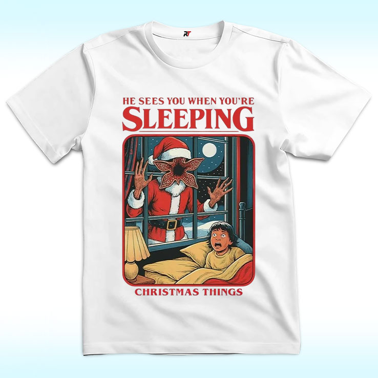 This hilarious horror-themed holiday “”He Sees You When You Are Sleeping Christmas Things”” Shirt blends festive cheer with Stranger Things–style terror. Featuring a Demogorgon in a Santa suit peeking through a moonlit window at a terrified child, the design is framed in red with bold text: “He Sees You When You’re Sleeping” and “Christmas Things.”