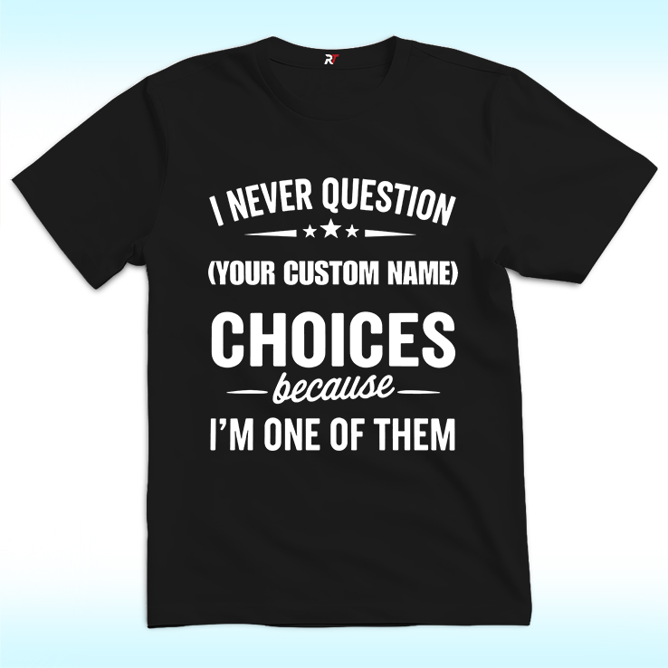 At the heart of the design is its customizable charm: the line (YOUR CUSTOM NAME) lets you insert anyone you love (or lovingly tease), transforming the message into an inside joke that feels tailor-made. The full phrase—“I never question [your custom name]’s choices because I’m one of them”—lands with the perfect blend of affection and self-aware humor.