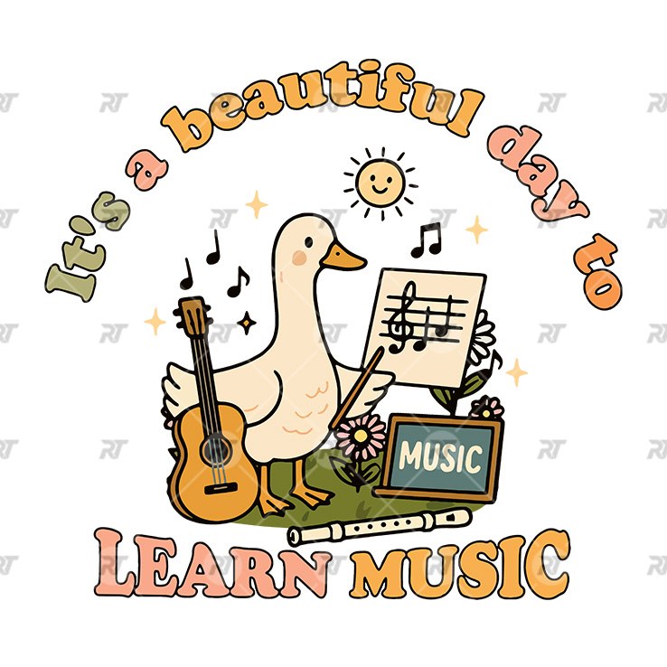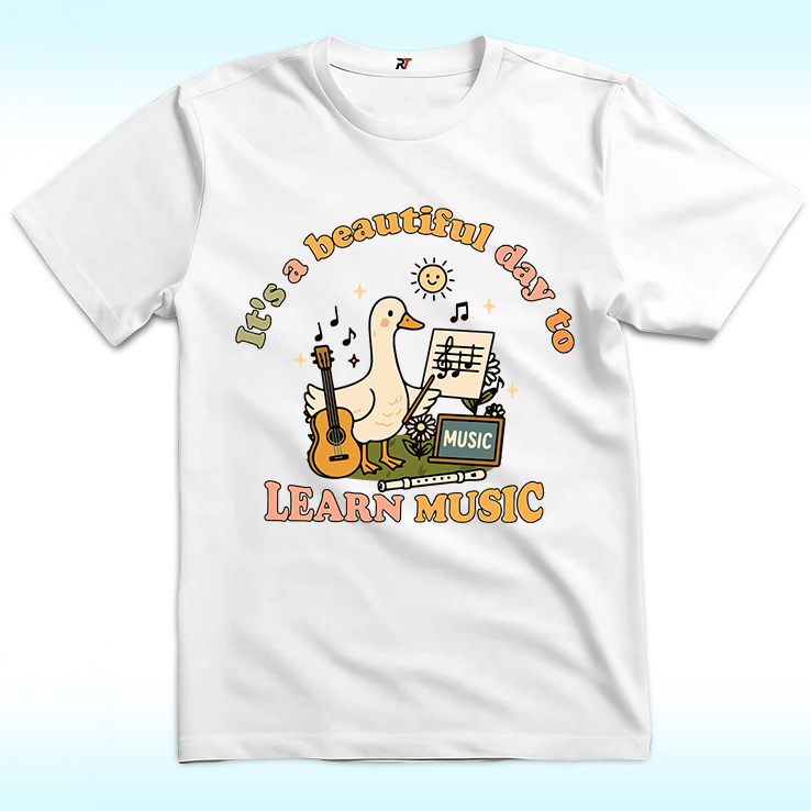The “It’s a Beautiful Day to Learn Music Goose” Shirt brings joy and creativity to life with its playful design. At the center, an enthusiastic goose spreads its wings wide while holding a sheet of music, surrounded by musical notes, a smiling sun, and a guitar resting by its side. A chalkboard labeled “Music” and scattered instruments complete the scene, evoking a whimsical classroom vibe.