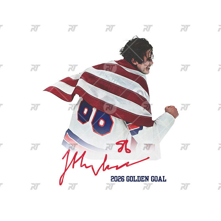 Draped in the American flag with his fist clenched in triumph, Hughes is frozen in celebration—a powerful symbol of determination, pride, and championship heart. The bold signature and “2026 Golden Goal” detail mark the exact instant that lifted the United States to the top of the Olympic podium.