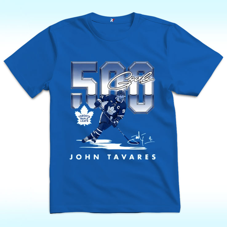 Celebrate a historic milestone in hockey with the John Tavares Toronto Maple Leafs 500 Goals Shirt. Featuring a bold “500 Goals” graphic in sleek silver block font, this design commemorates the moment the Maple Leafs’ captain etched his name among the league’s elite. A dynamic image of ice hockey forward Tavares in full stride across the ice anchors the layout, while the Toronto Maple Leafs logo and his signature add authenticity and pride. Set against a vibrant blue backdrop, this John Tavares Toronto Maple Leafs 500 Goals Shirt is the perfect tribute to a legendary scorer — and a must-have for every Leafs fan witnessing greatness in real time.