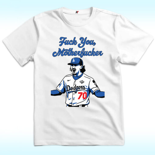 Bold. Unfiltered. Unapologetically fired up. This Justin Wrobleski Fuck You Motherfucker Shirt captures the raw emotion and fierce spirit of Los Angeles Dodgers pitcher Justin Wrobleski in a moment fans won’t soon forget. Featuring Wrobleski in full uniform—arms out, shouting with intensity—the design uses Dodgers blue and red to spotlight his #70 jersey in classic style. Across the chest, a retro script font spells out “Fuck You, Motherfucker,” echoing the passion, fire, and grit that define the game.