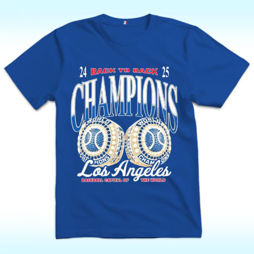 Celebrate back-to-back glory with this electric blue LA Dodgers Back to Back Champs 2024-2025 Shirt that screams dynasty. Front and center, two dazzling championship rings marked “2024” and “2025” shine proudly — symbols of the Dodgers’ historic repeat as World Series champions. Above them, the word “CHAMPIONS” arcs boldly, while Los Angeles claims its rightful title as Baseball Capital of the World.