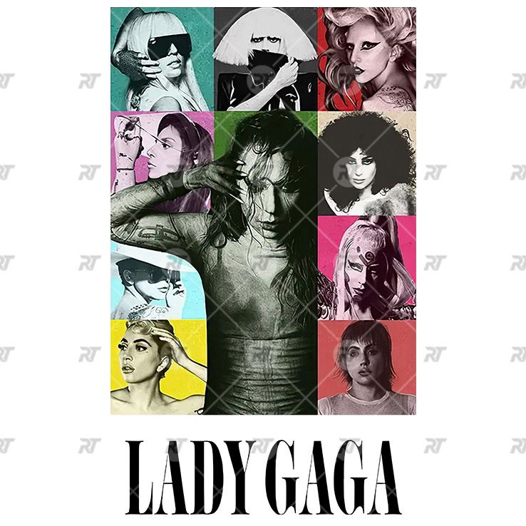 At the center, a striking grayscale image of Gaga grounds the chaos, surrounded by vibrant snapshots of her artistic evolution. The bold “LADY GAGA” text beneath pulls the entire design together with dramatic flair.