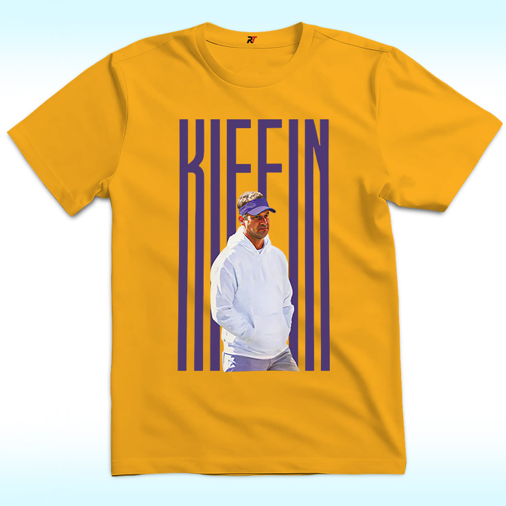 This bold gold Lane Kiffin Shirt captures the swagger of Lane Kiffin as he steps into the Louisiana State spotlight. Centered on the shirt is a stylized image of Kiffin in his signature visor and white hoodie, framed by towering vertical purple text that spells “KIFFIN” with confident flair. The striking contrast of LSU’s purple and gold makes this Lane Kiffin Shirt pop — perfect for fans ready to ride the next wave of college football energy.
