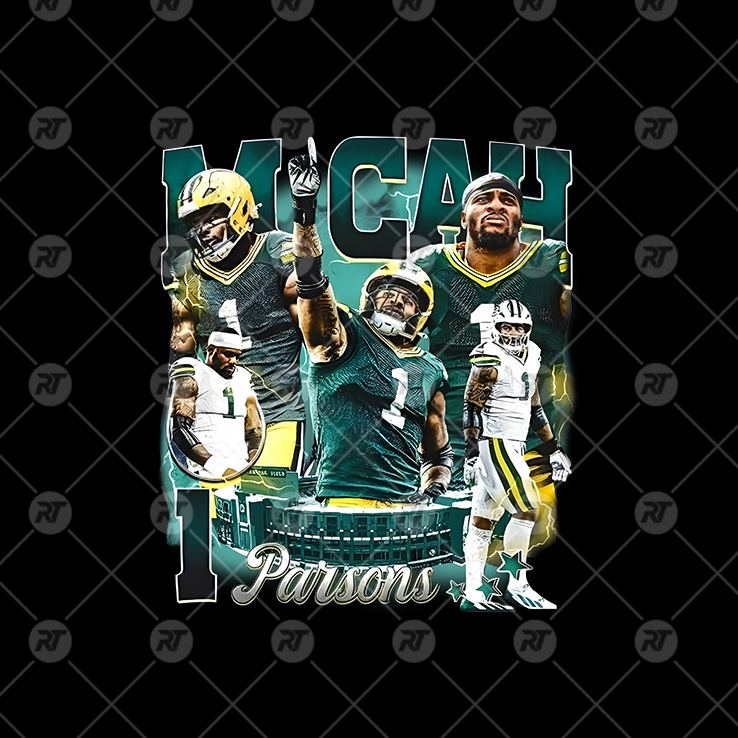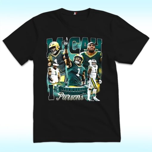 This Micah Parsons M1CAH Shirt is a bold celebration of one of football’s fiercest talents—football defensive end Micah Parsons. Featuring a dynamic collage of action shots, it captures Parsons in motion wearing green and gold, a clear nod to the Green Bay Packers.