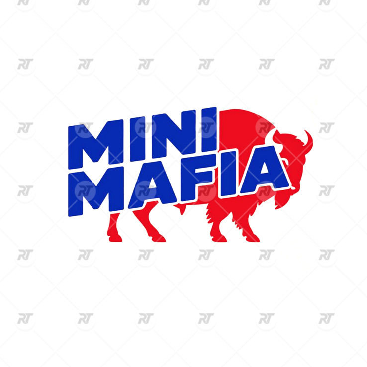 Bold blue lettering proclaims “MINI MAFIA” across a striking red silhouette of the iconic buffalo — a playful yet powerful nod to Bills Nation pride. Set against a crisp white tee, the design pops with bright energy and team spirit.