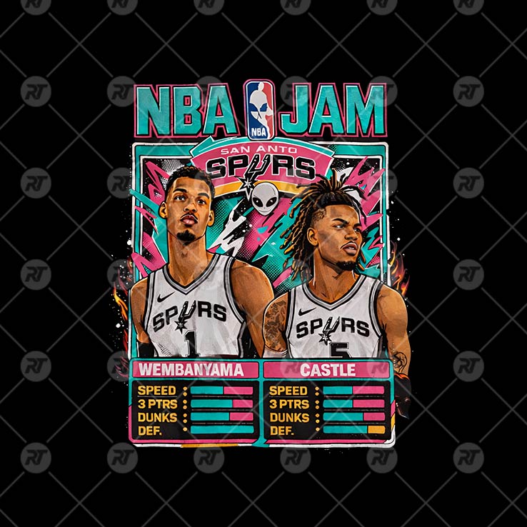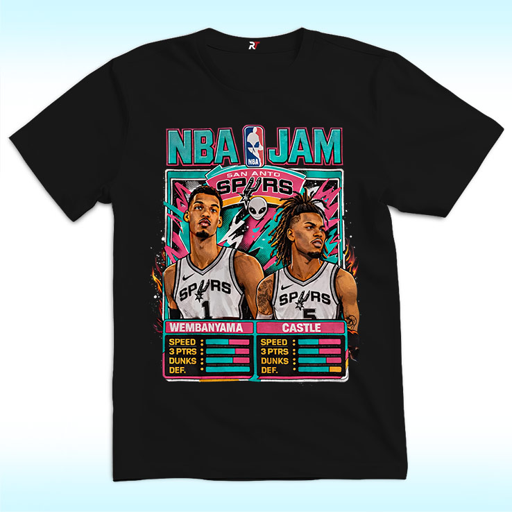 A retro arcade vibe meets the future of the Spurs. The NBA Jam Spurs Retro Roster Shirt brings back the high-energy feel of classic basketball video games while spotlighting rising stars Victor Wembanyama and Stephon Castle. Inspired by the iconic NBA Jam aesthetic, the artwork transforms both players into larger-than-life characters, celebrating their growing impact on the San Antonio Spurs.