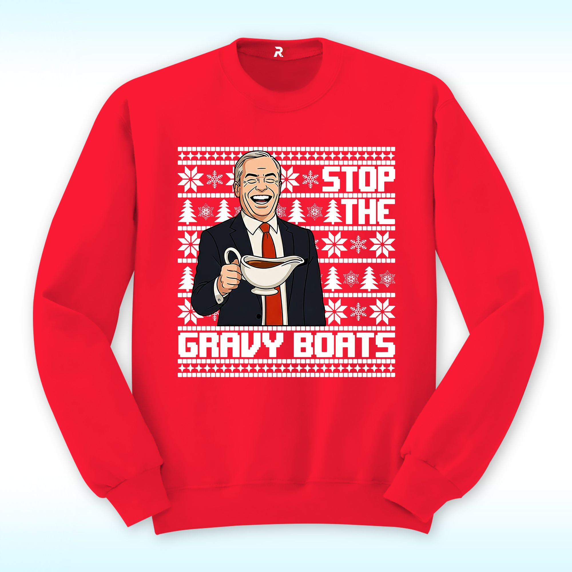 With a big grin and a steaming gravy boat in hand, Farage is reimagined in classic ugly-sweater style, surrounded by holiday cheer — snowflakes, reindeer, Christmas trees. The phrase “Stop the Gravy Boats” parodies his infamous slogan with a perfectly absurd holiday spin.