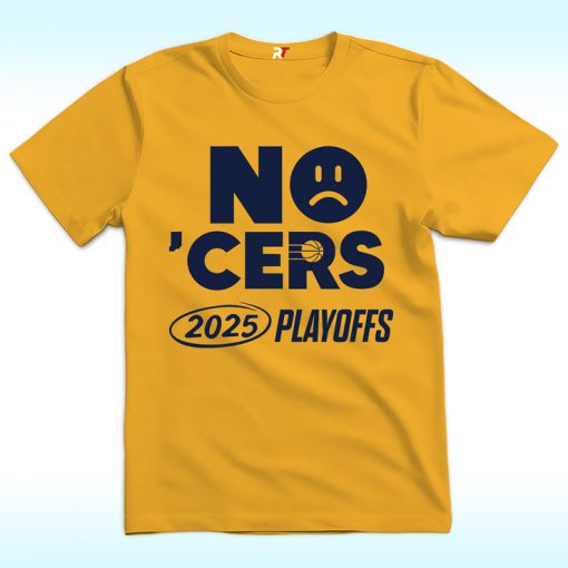 No ‘Cers Sad Face Indiana Pacers 2025 Playoffs NBA Finals Shirt is heartbreak stitched into gold cotton—a fan’s lament turned into bold, ironic style. Across the chest, big navy letters spell out “NO ‘CERS,” punctuated by a sad face where hope used to be. Just below, “2025 Playoffs” sits inside a hand-drawn oval, the kind of scrawl that feels rushed, raw, and painfully real.