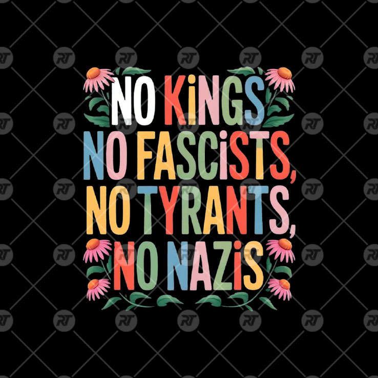 No Kings, No Fascists, No Tyfants, No Nazis Shirt fuses a bold anti-authoritarian message with a vibrant, peace-loving aesthetic. At its center blooms a large peace sign made of colorful flowers—an unmistakable symbol of unity, resilience, and the counterculture spirit.