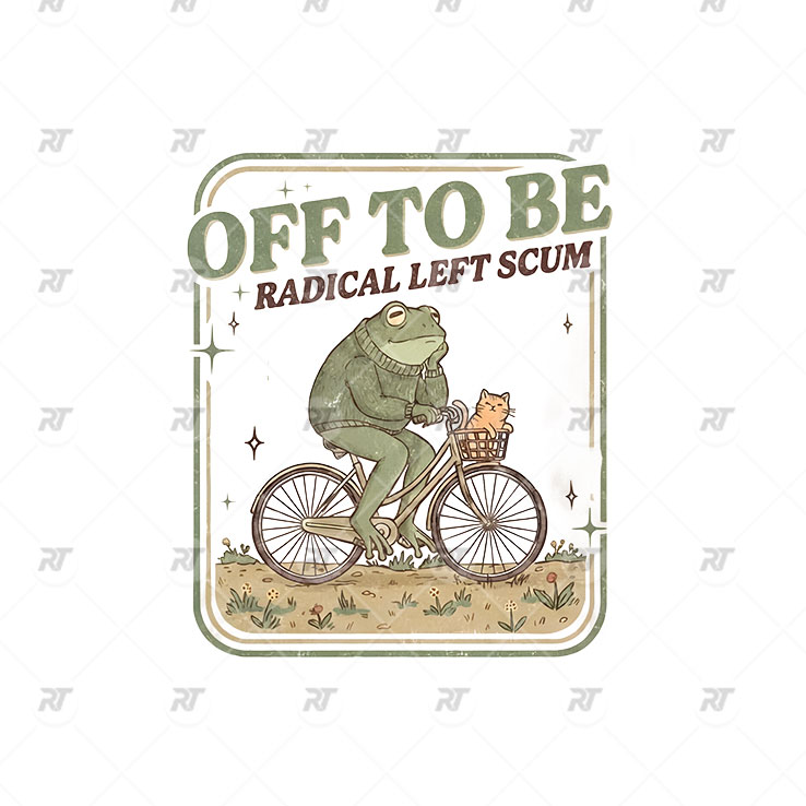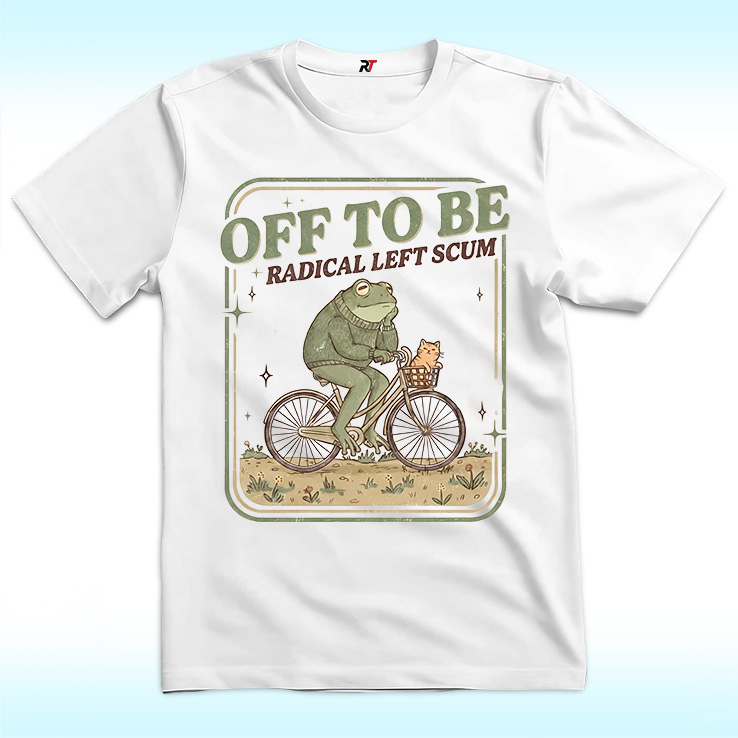 At first glance, the Off To Be Radical Left Scum Frog Shirt feels light and playful. Centered on the shirt is a whimsical illustration of a cozy frog pedaling a bicycle, with a small cat riding along in the basket—a scene that feels calm, cheerful, and almost storybook in tone. That softness is intentional, setting up a striking contrast with the message it carries.