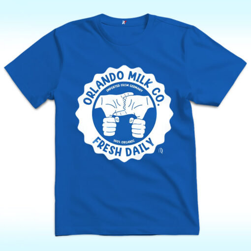 Altogether, this Orlando Milk Co Fresh Daily Imported From Germany Shirt turns a faux-brand logo into a playful statement piece—perfect for fans of satire, visual misdirection, and humor that doesn’t take itself too seriously.