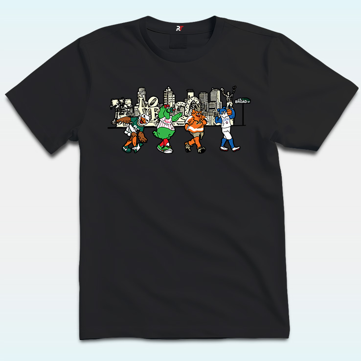 Set against the iconic Philadelphia skyline, this Philly Mascot Skyline Shirt brings together the city’s most beloved mascots in one playful scene. Marching across the horizon in a cheerful parade, each mascot—from the Eagles to the Flyers, Phillies, and 76ers—shows off the personality and team pride fans know so well.
