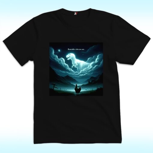 Rather than shouting its message, this Remember Who You Are Shirt speaks through symbolism. A lone chicken stands beneath a moonlit sky, gazing upward as a glowing dinosaur emerges from the clouds, accompanied by the words “Remember who you are.” The imagery immediately evokes themes of origin, identity, and forgotten strength.