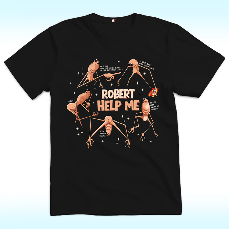 Centered on the phrase that launched a thousand memes, “Robert, help me,” this shirt showcases Marcus in all his unhinged glory: sipping too much “moon juice,” sneaking off with stolen soup, fearing mysterious doom, and—of course—spiraling into panic. Each sketch captures a different flavor of worm-like existential crisis, turning his rambling catchphrases into wearable surrealism.