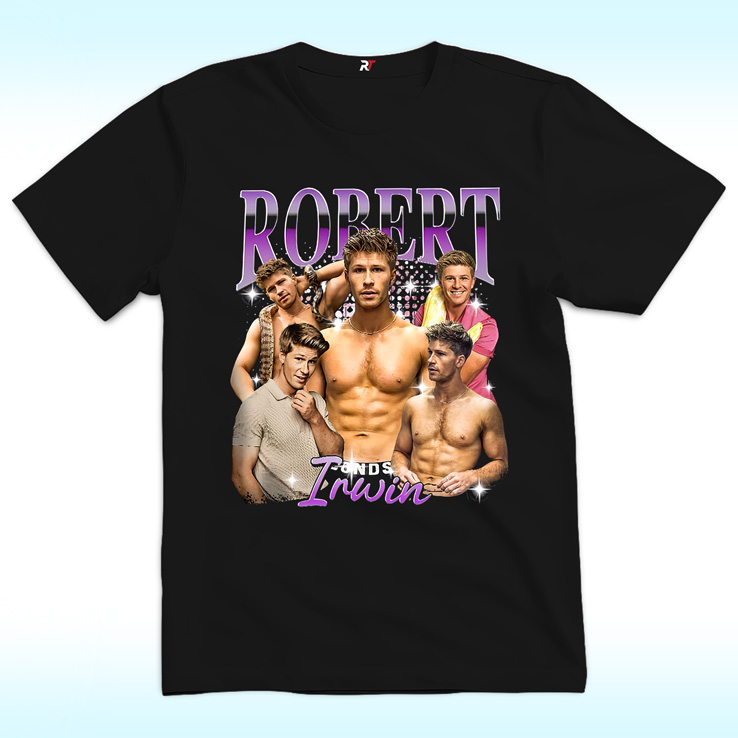 This Robert Irwin Win “”Dancing with the Stars”” Shirt celebrates Robert’s epic Dancing with the Stars win with a vibrant collage of his standout moments, from shirtless showstoppers to red-carpet charm. Styled in a sparkly purple retro aesthetic with his name shining like a marquee, it’s a tribute to the boy who grew up wrestling crocs and now spins effortlessly under the spotlight.