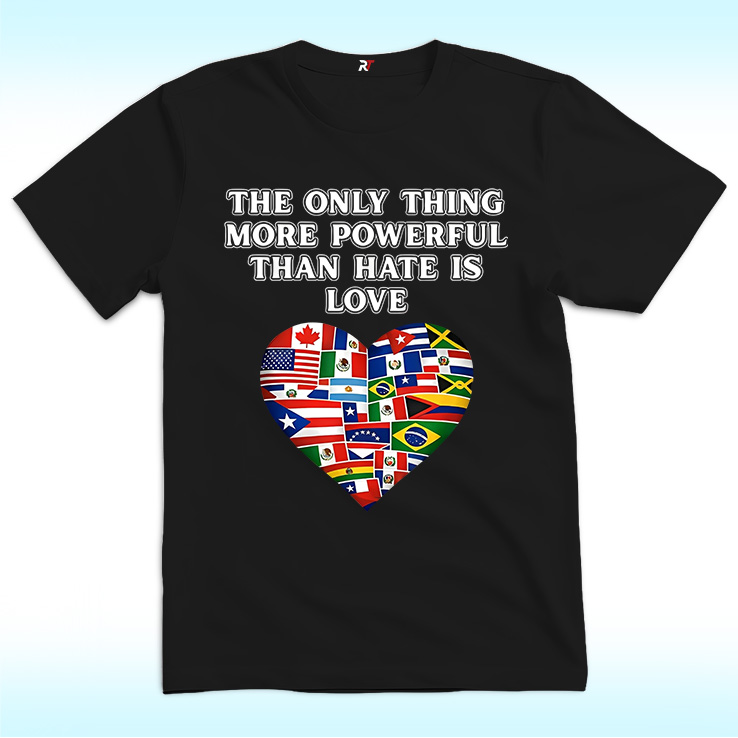 Each flag flows seamlessly into the next, creating a colorful mosaic that represents unity across borders, cultures, and languages. More than just a graphic, this The Only Thing More Powerful Than Hate Is Love Shirt is a wearable reminder that compassion, empathy, and shared humanity have the power to bring the world closer together.