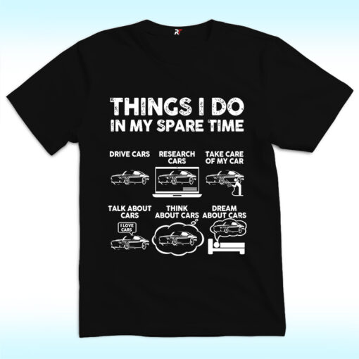 For anyone whose life revolves around horsepower and hot rods, this Things I Do In My Spare Time Shirt tells the truth loud and clear. Featuring a bold, distressed title in all caps — “THINGS I DO IN MY SPARE TIME” — the design humorously breaks down the daily life of a true car enthusiast: driving cars, researching cars, caring for cars, talking about cars, thinking about cars, and even dreaming about cars.