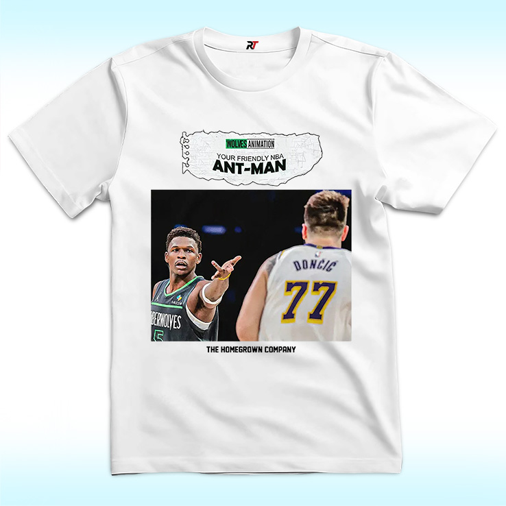 Your Friendly NBA Ant-Man Anthony Edwards Shirt captures a now-iconic moment: Ant-Man pointing with that signature edge, sizing up Luka Dončić mid-game. It’s more than a gesture — it’s a declaration of confidence, charisma, and control. Above the image, the “Wolves Animation” branding turns the scene into a comic-book tribute, giving Edwards true superhero status on and off the court.